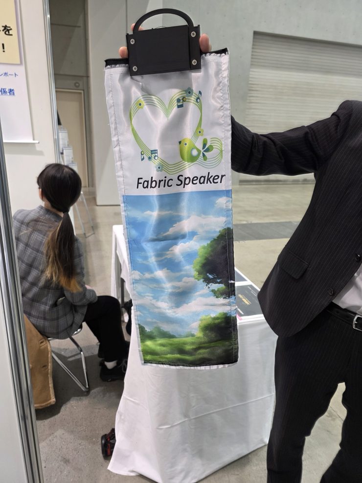 センシアテクノロジーは,薄く柔らかい「ファブリックスピーカー・ポータブル」を展示した.同社は産総研発のベンチャー.本製品は導電性繊維を用い,面全体から音を放出できる革新的なスピーカ.従来の接着技術とは異なり,独自の縫製技術のみで材料を積層することで,接着剤による硬さを排除し,布本来の柔軟な風合いを維持することに成功した.