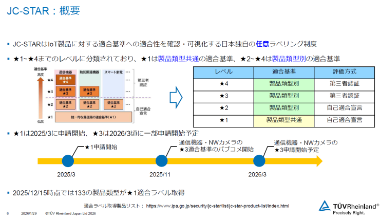 日本では,IoT製品向けの任意ラベリング制度としてJC-STARが運用されている.図1の★1から★4までの段階的な適合レベルが設定され,★1は製品類型共通の基礎要件として自己適合宣言で取得可能である.2025年3月から申請が開始され,すでに多数の製品が取得している.さらに,2025年11月に日本と英国の間で相互承認に向けた覚書が締結され,2026年以降はJC-STAR★1取得製品が英国PSTI法の技術要件に適合するとみなされる点は,日本企業にとって大きな実務的メリットである.