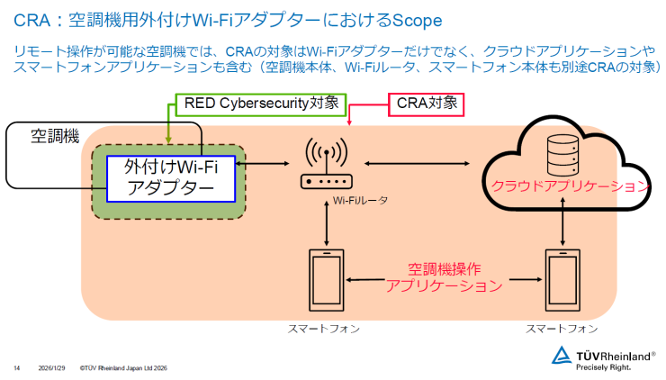 CRAはREDよりも対象範囲が広く,有線・無線を問わず,何らかの形でデータ接続を行うデジタル要素を含む製品全般が対象となる.製品本体だけでなく,連携するクラウド・サービスやスマートフォン・アプリなども評価対象に含まれ得る点が特徴である.