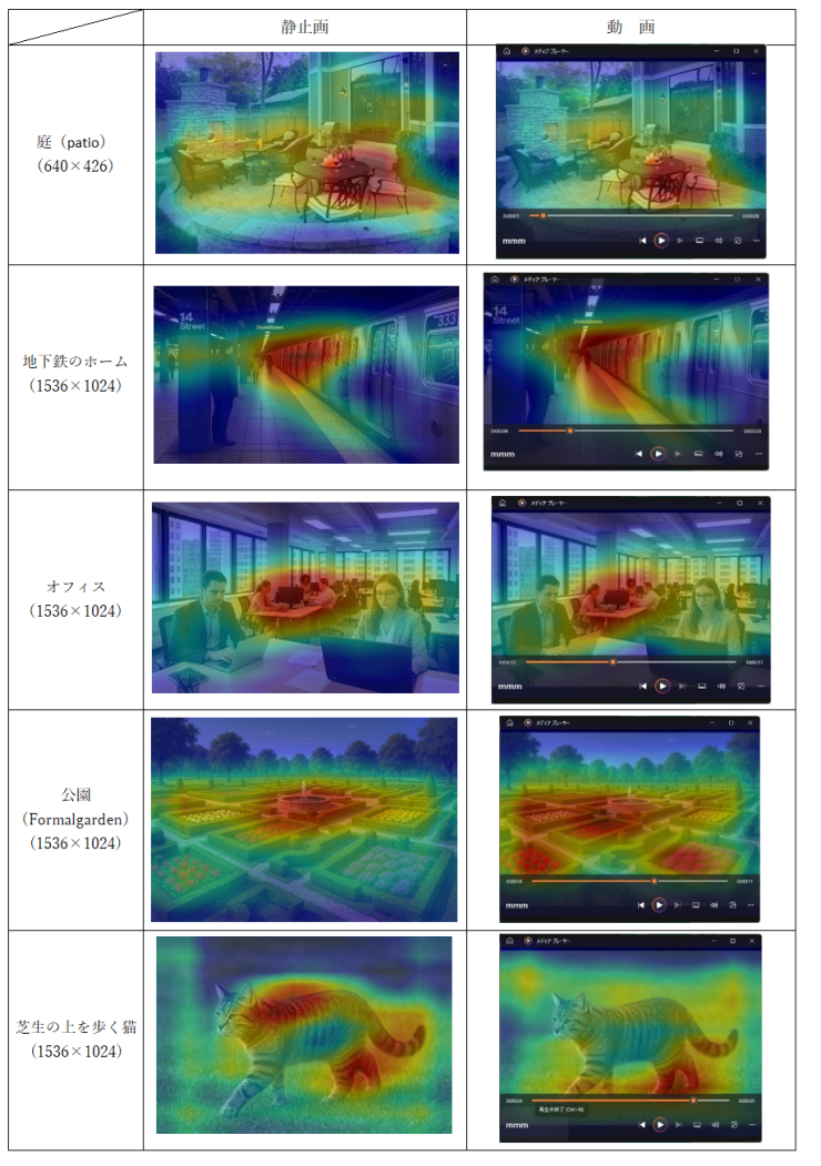 多くのシーンでは,静止画と動画で同様の傾向が得られましたが,公園や芝生の猫など複数の特徴を含むシーンでは,動画入力時に注目部位が変化し,推定結果が安定化または誤認に振れるケースが確認されました.特に公園(formal garden) では,静止画が噴水周辺を重視したのに対し,動画では花畑全体を参照し,formal_gardenの確率が大幅に向上するなど,注目領域の違いが推定結果に影響しました.