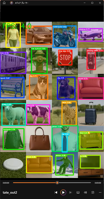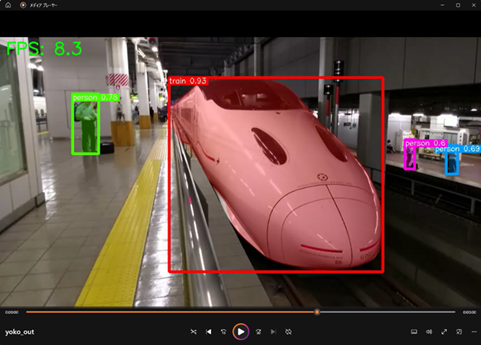 人物と新幹線を区別して検出できており,静止画検証と同などの結果が得られました.処理速度は約8FPSと比較的高速で,動画入力でも安定した性能が確認できました.