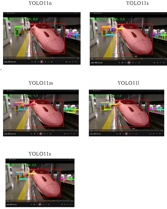 backpackはYOLO11nでは検出されませんでしたが,それ以外のモデルでは安定して検出できています.trainは,全てのモデルで安定して検出できており,モデルによる差は見られませんでした.合計検出数は,YOLO11mおよびYOLO11xが最も多い結果となり,FPS(フレーム毎秒)は,モデル・サイズが大きくなるほど低下し,YOLO11nでは8.53FPSと非常に高速ですが,YOLO11xでは0.57FPSまで低下しています.