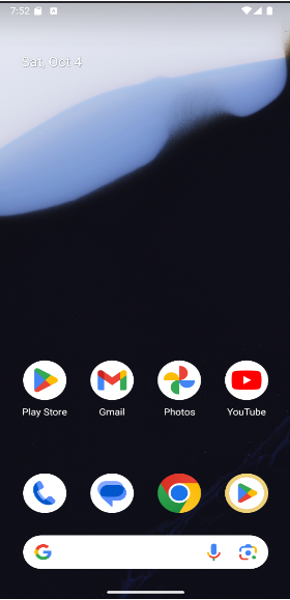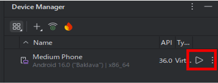 デバイス一覧の右側にある 再生ボタン(図10)をクリックすると,Medium Phoneが起動します.初回起動時はシステム構築やキャッシュ生成が行われるため,Phone画面が表示されるまで数分程度待機してください.Phone画面でアイコンが上下に動いている間は,ファイルの初期化中です.動作が落ち着き,画面が静止した状態になれば起動完了です(図11).