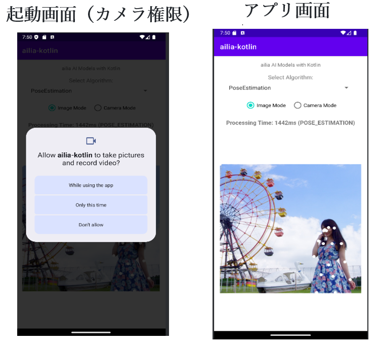 図13 起動画面(カメラ権限)とアプリ画面
