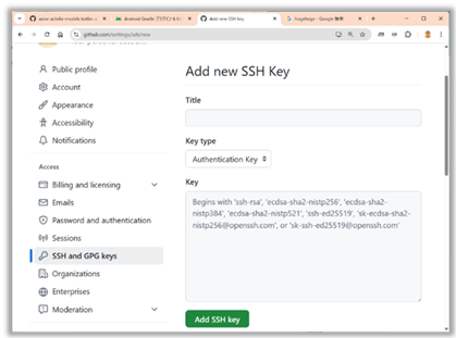 ・2,「Add new SSH key」画面が表示されたら,Keyの入力欄にid_ed25519.pubの内容をそのままコピーして貼り付ける