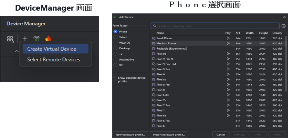 Androidアプリを動作確認するために,Android StudioのDevice Managerで仮想デバイス(Virtual Device)を作成します.このための手順を次に示します.