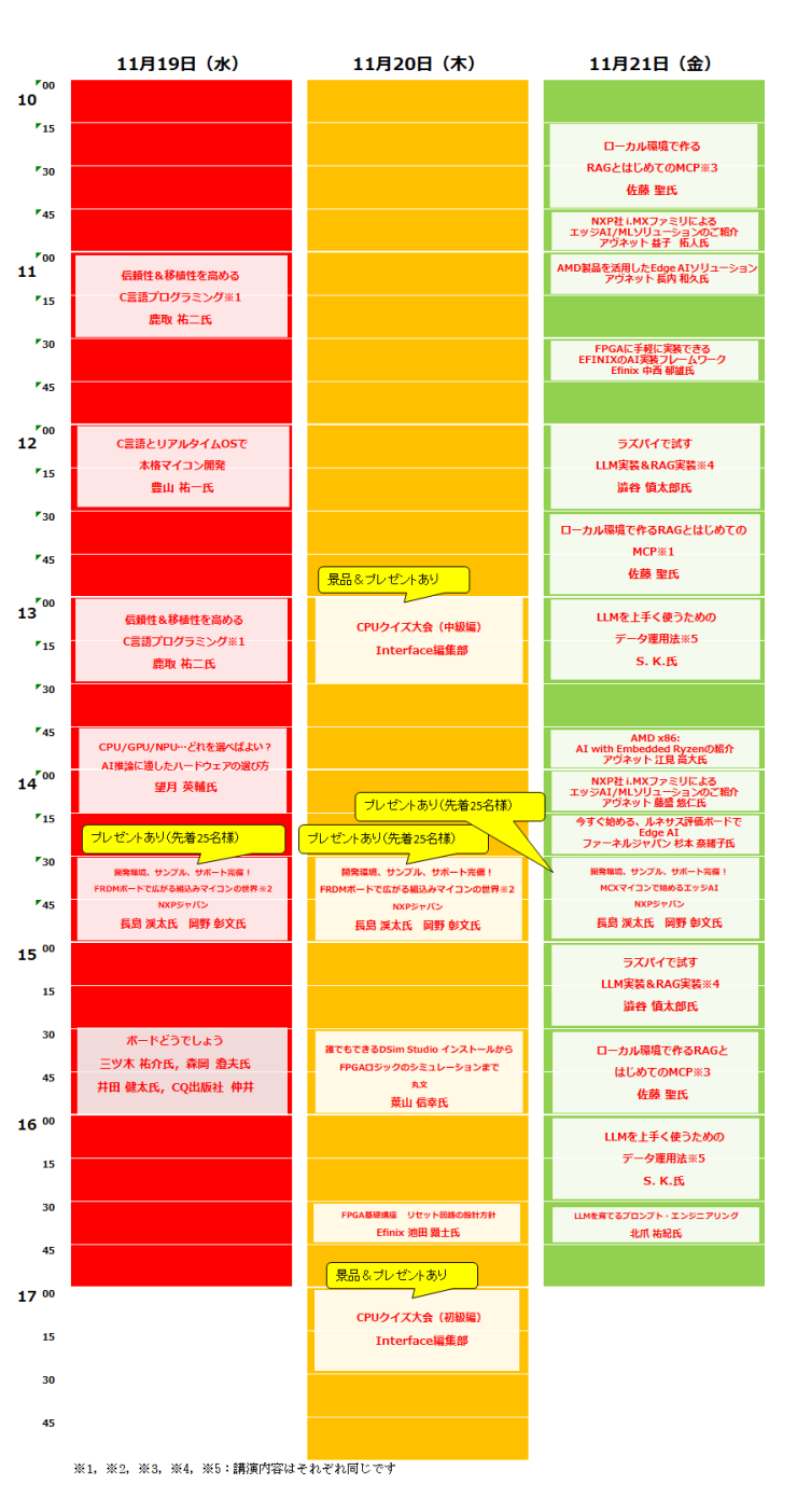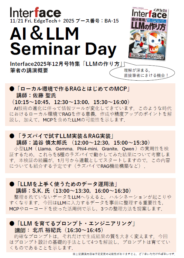 インターフェース編集部は,2025年11月19日(水)~21日(金)にパシフィコ横浜で開催されるEdgeTech+ 2025に出展します.ブースではセミナ・コーナを設置し,本誌筆者や関係者によるさまざまなミニセッションを開催する予定です.クイズ大会やAI関連セミナなど,さまざまなイベントを用意しています.また,役立つノベルティ・グッズの配布や,雑誌・書籍の直売所,キット商品の展示も行いますので,ぜひお立ち寄りください.