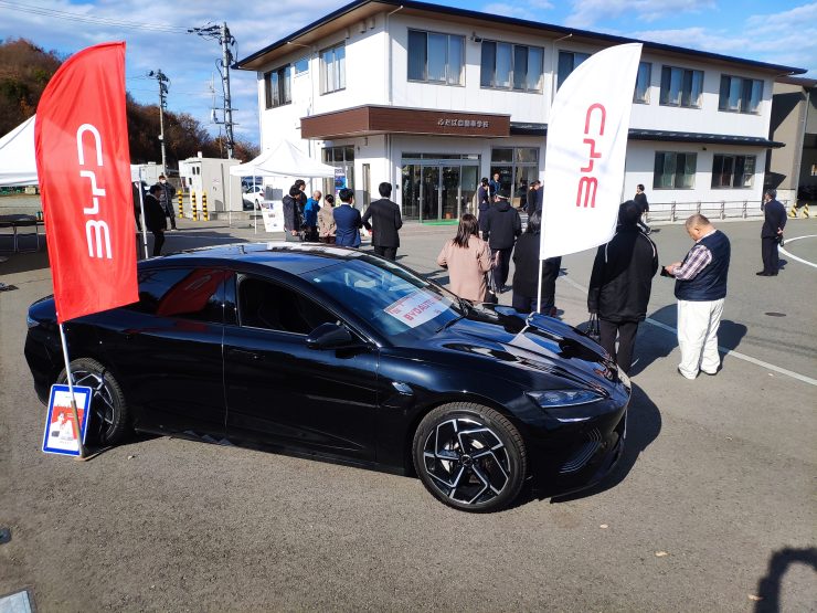 BYDによるバッテリカーの展示には高校生も興味津々でした.