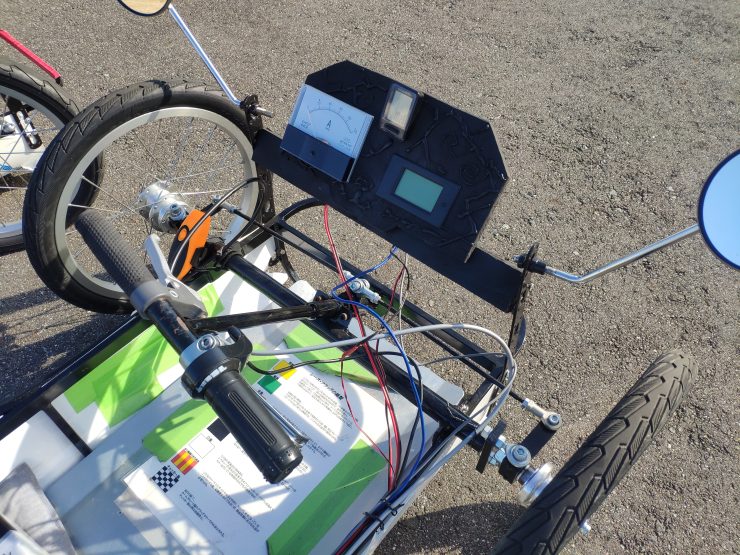 ミニカートの改造例として,液晶を使ったスピードメータや,独自のマイコン・ボードに置き換えたコントローラが展示され,希望者による試走も行いました.