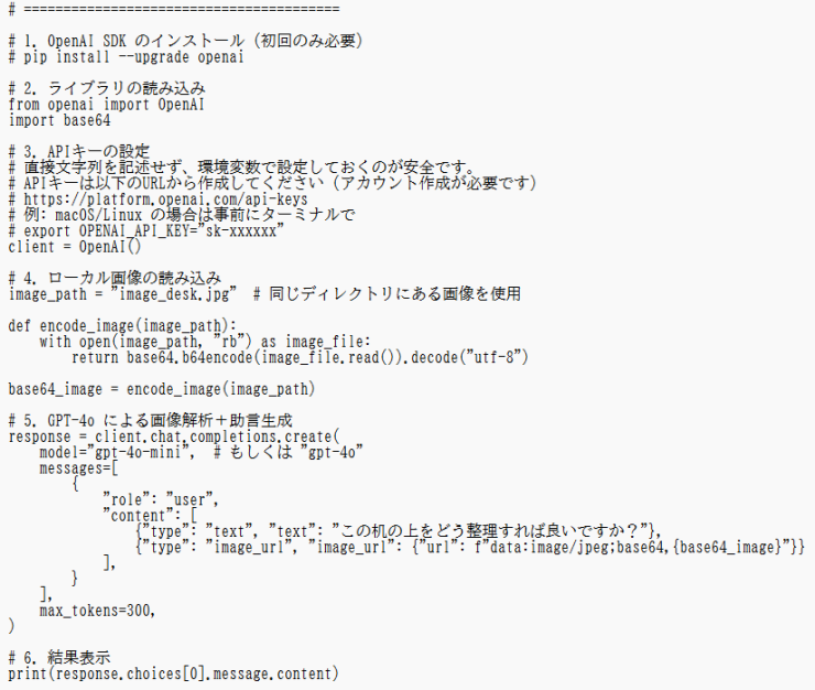 リストAにGoogle Colabで動作するサンプル・コード(GPT-4o利用を想定)を示します.これに写真Aの画像を入力すると,散らかった机の画像がアップロードされ,どのような手順で掃除をすべきか助言してくれます.特にGPT-4VのようなAPIベースにVLMは既存業務に組み込みやすく,社内システムと連携させることで多様な業務効率化が期待できます.例えば,次のような業務に活用できるでしょう.