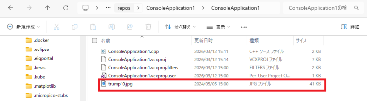 この中のcv::imreadは,画像ファイル(trump10.jpg)を読み込む命令なので,ConsoleApplication1\ ConsoleApplication1フォルダ(ConsoleApplication1フォルダの中にさらに ConsoleApplication1フォルダがある)の中に対象の画像ファイル(trump10.jpg)を入れておきます.