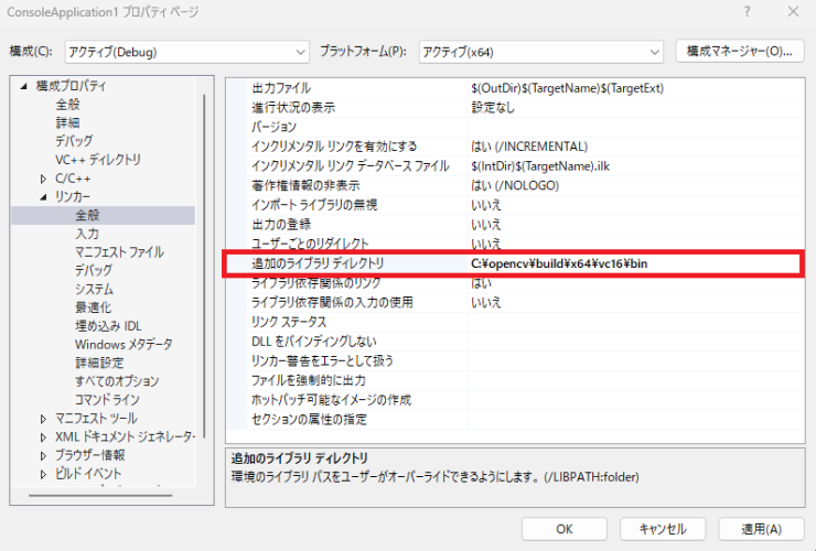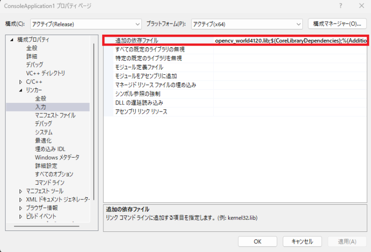 Visual Studioメイン画面上部の「プロジェクト」から「ConsoleApplication1のプロパティ」を開きます.まずは,「リンカ―」の「全般」にある「追加のライブラリ」に次を記述してください.