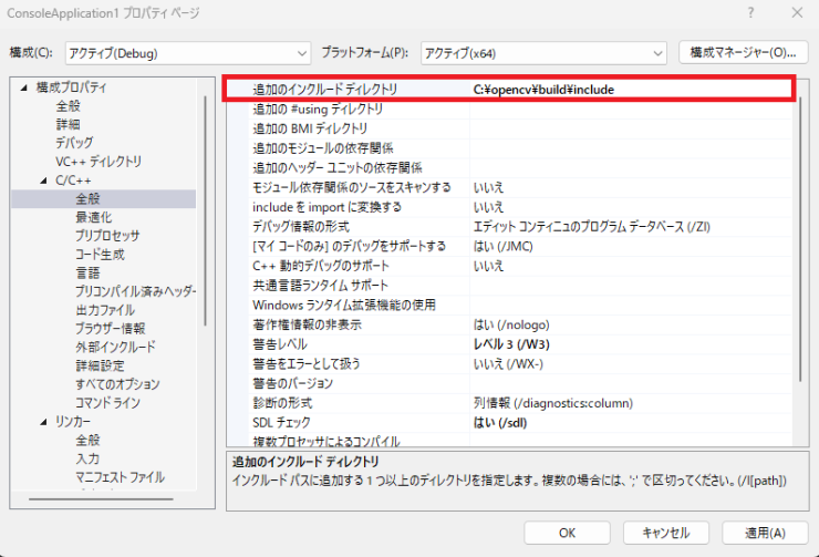 次に「C/C++」の「全般」にある「追加のインクルードディレクトリ」に次を記述してください.