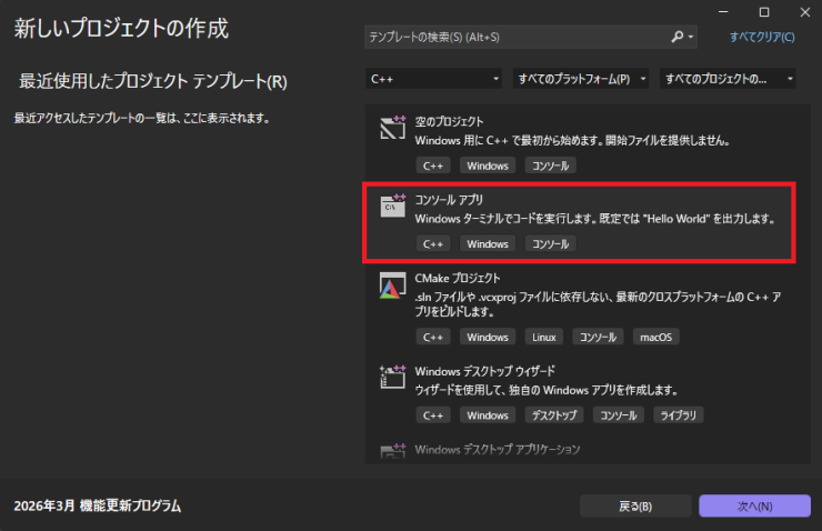 次に,アプリの種類でC++言語の「コンソールアプリ」を選択し,「次へ」をクリックします.