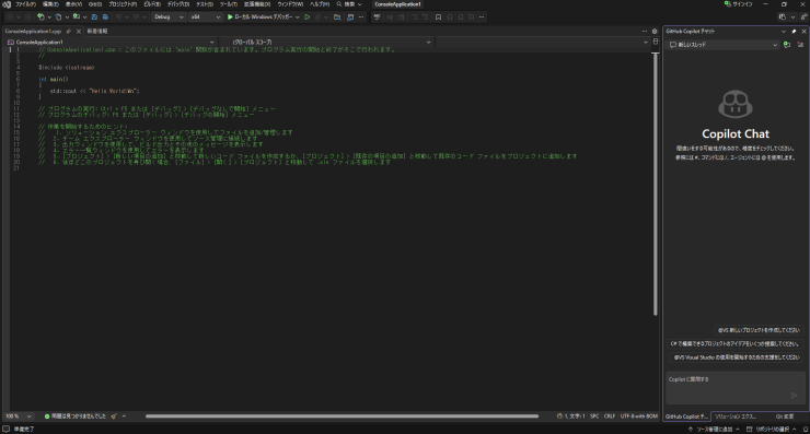 なお,ここでは「ConsoleApplication1」とします.すると,Visual Studioのメイン画面が表示されます.